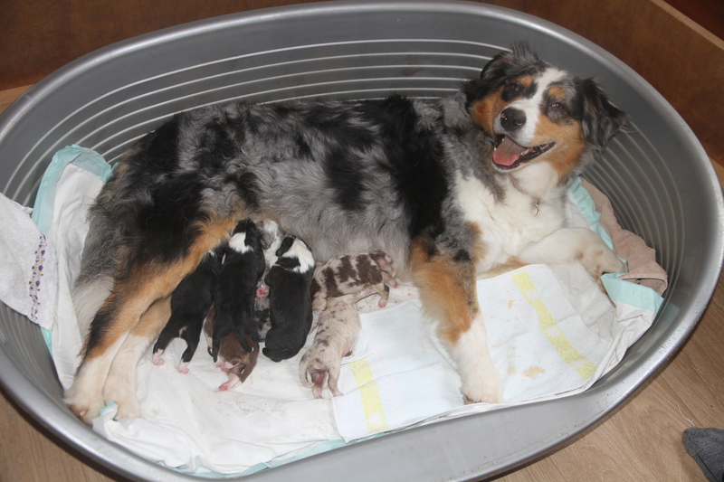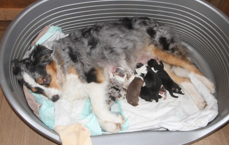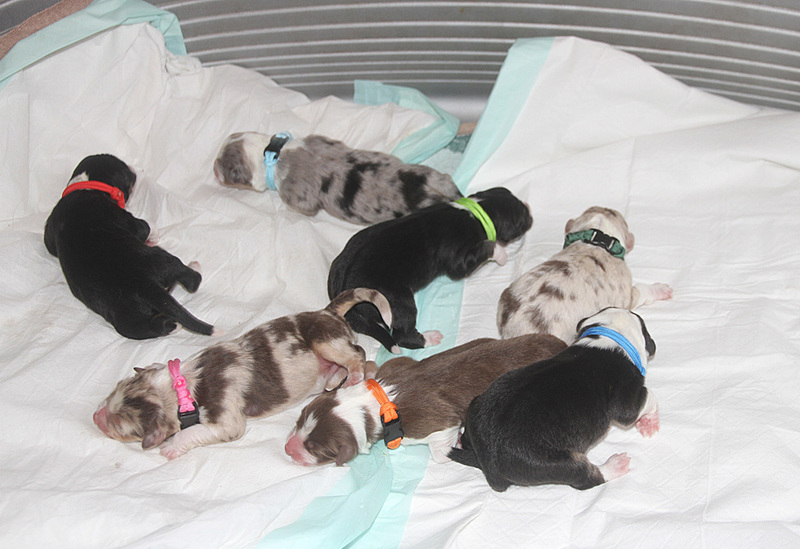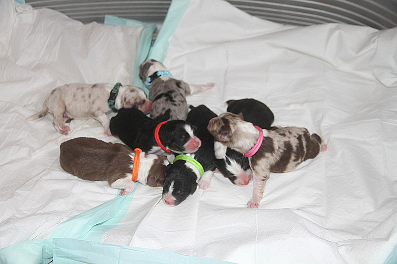 Auf den Bildern fehlt leider die letzte kleine blue-merle Hündin (gelb), die ist erst 3,5 Stunden später aber ohne Probleme auf die Welt gekommen und deshalb nicht auf